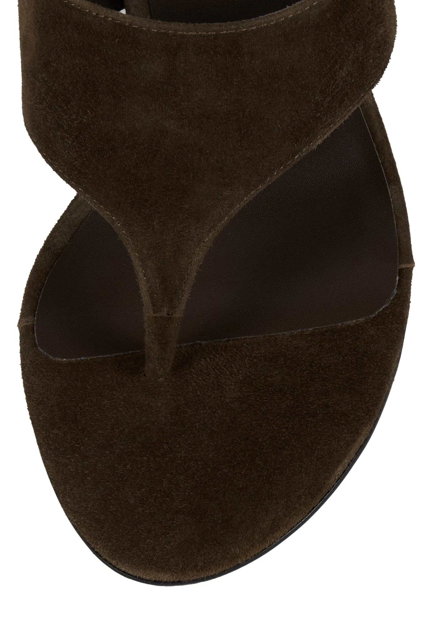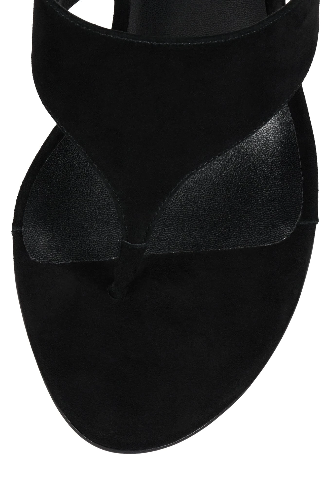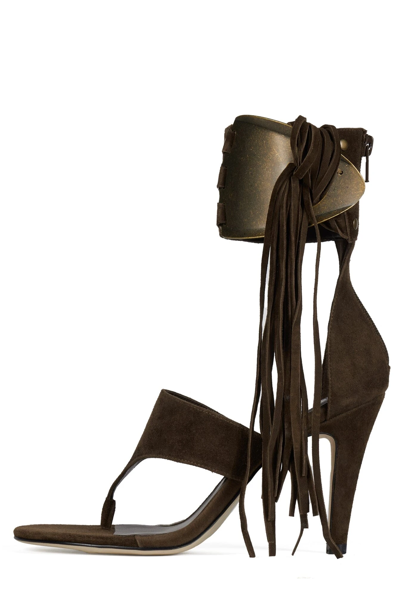 Heeled thong sandal with metal ornament and fringe detailed ankle strapÂ