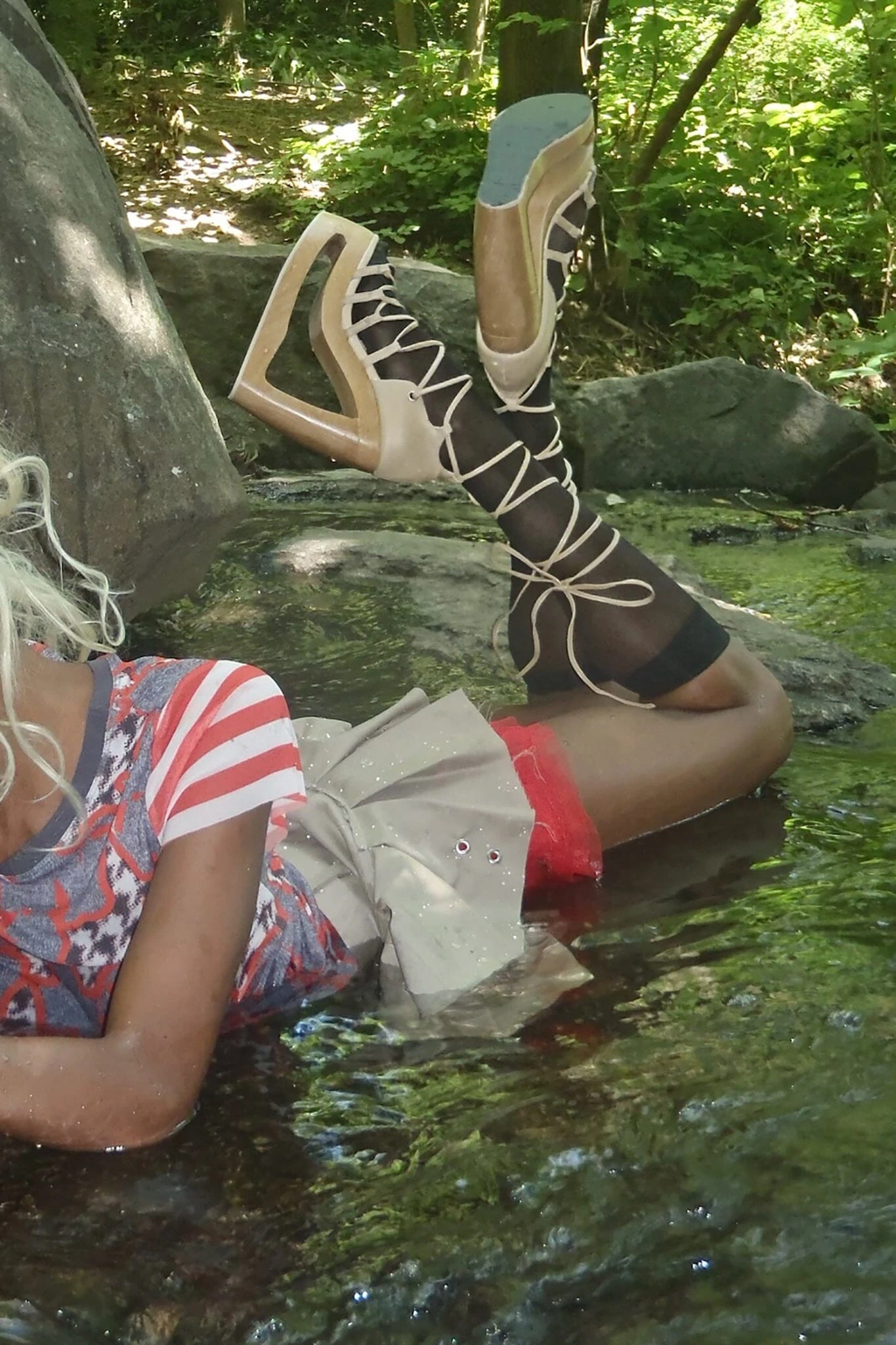 Strappy lace-up platform sandal with cut-out wedge.