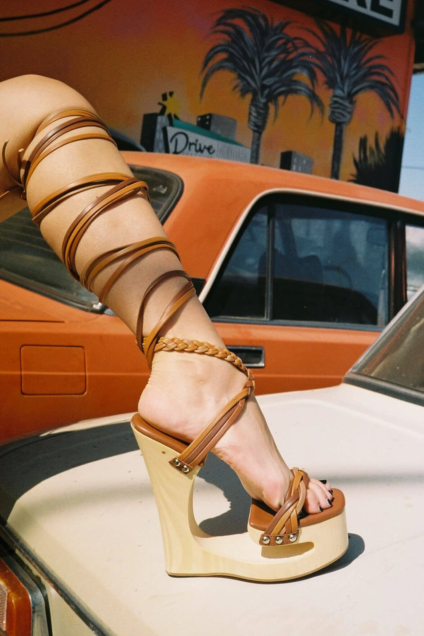 Knee-high multi-strap wrap-around heel on a sculpted wooden platform wedge
