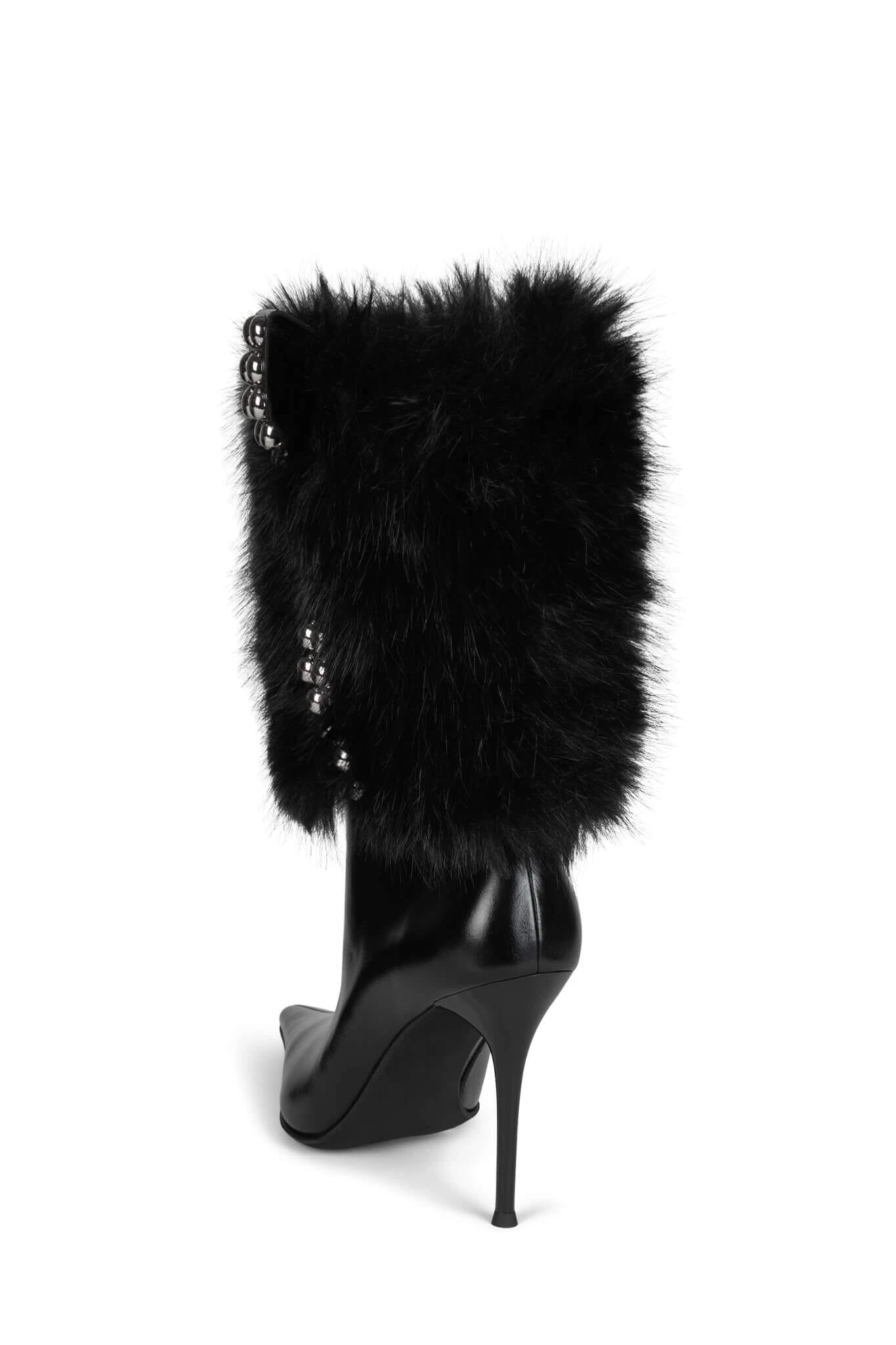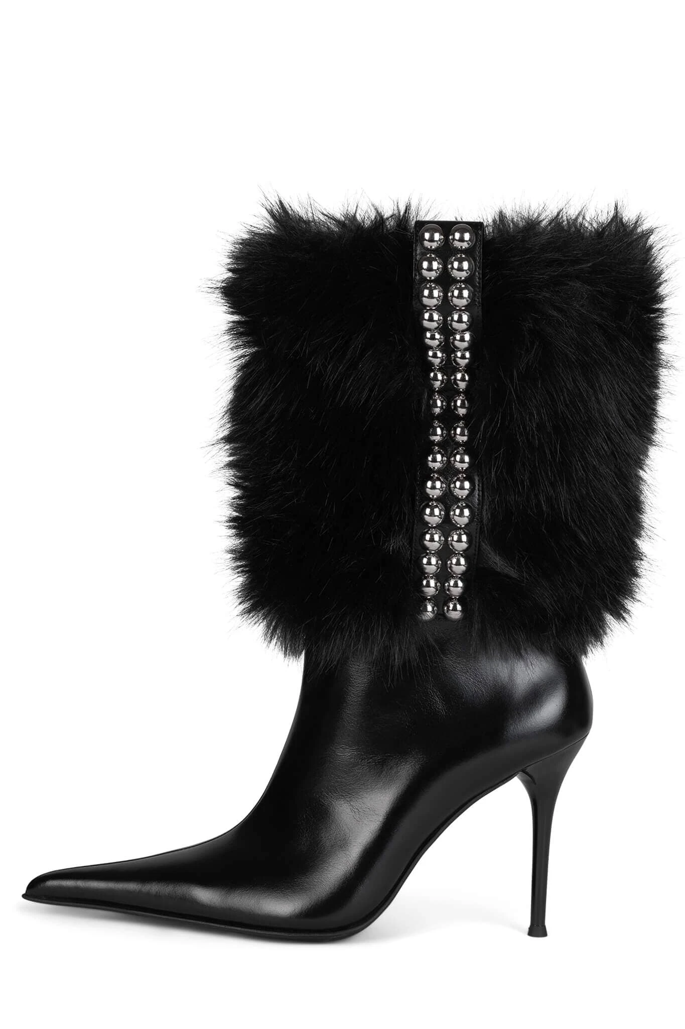 Mid-calf faux-fur pointed-toe stiletto boot with metal stud detailย