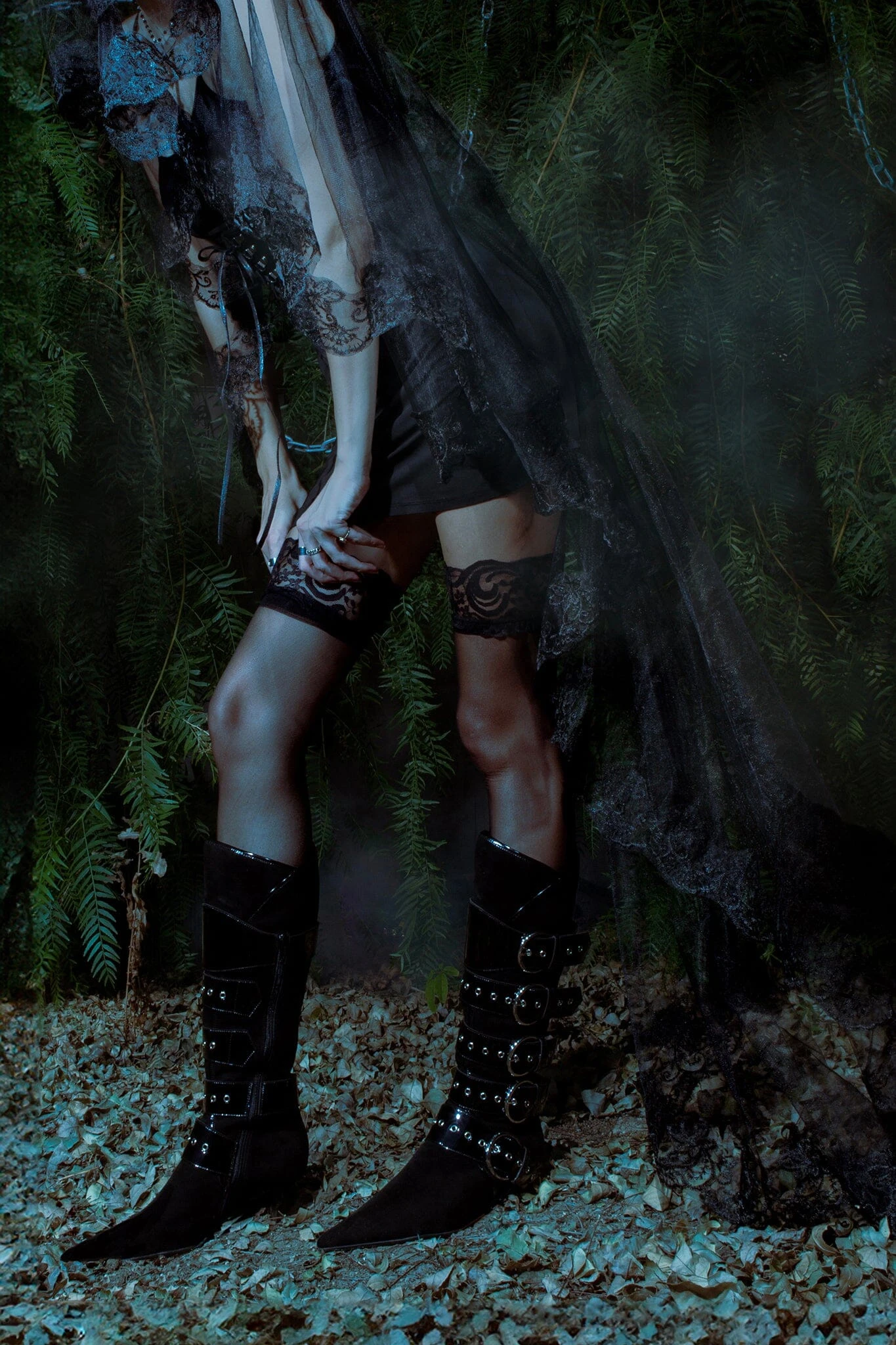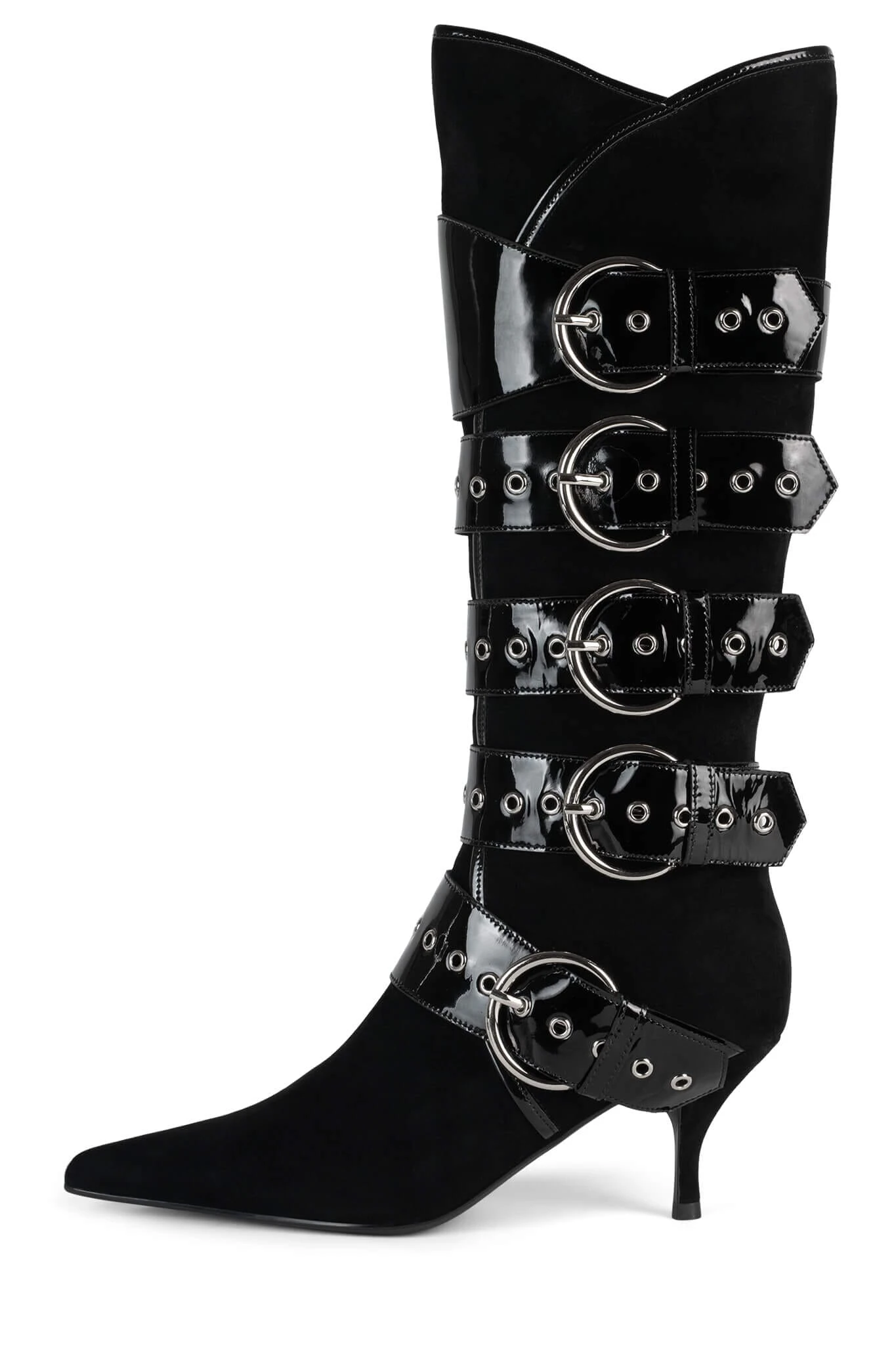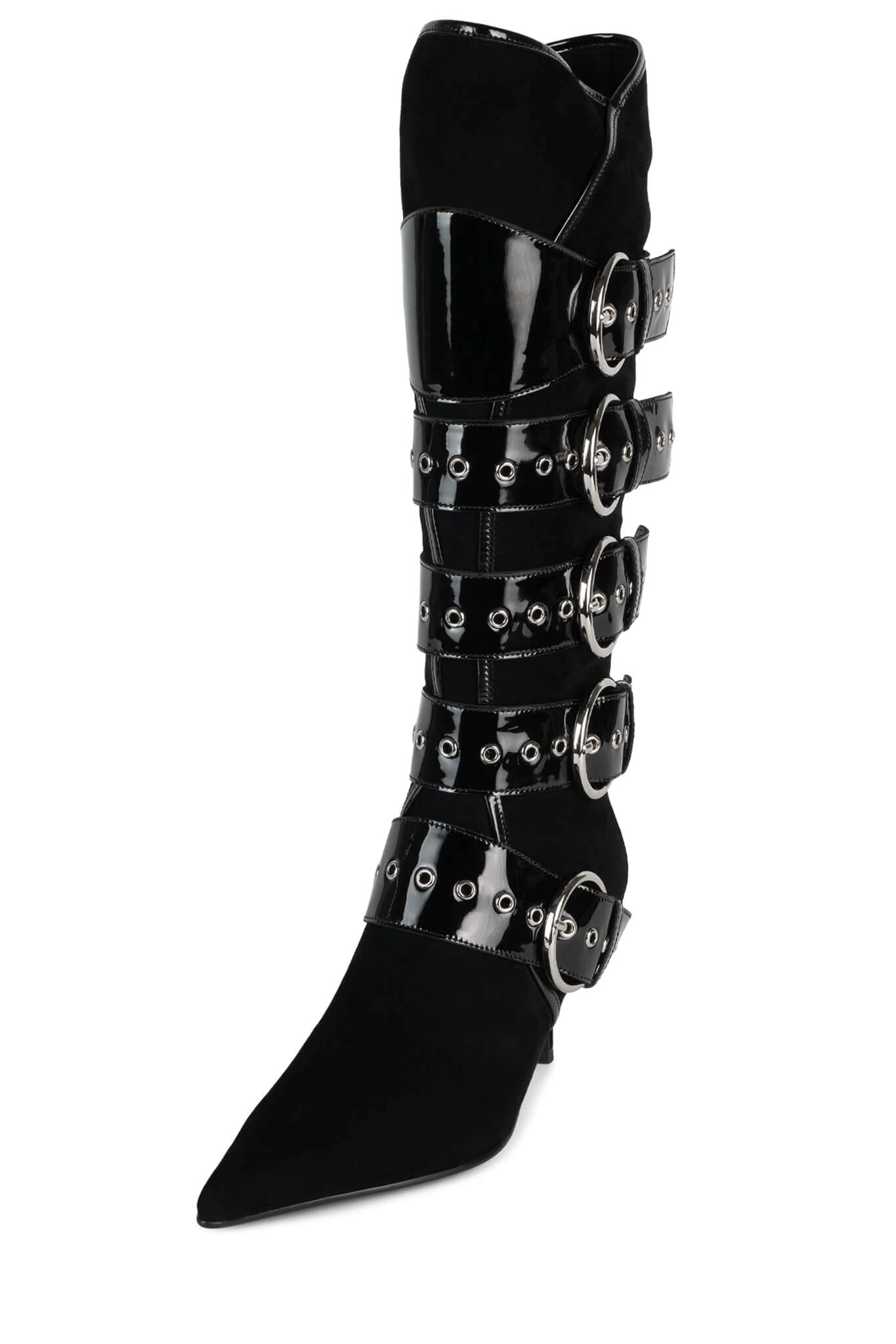 Knee-high pointed-toe heeled boot with strap and buckle detail
